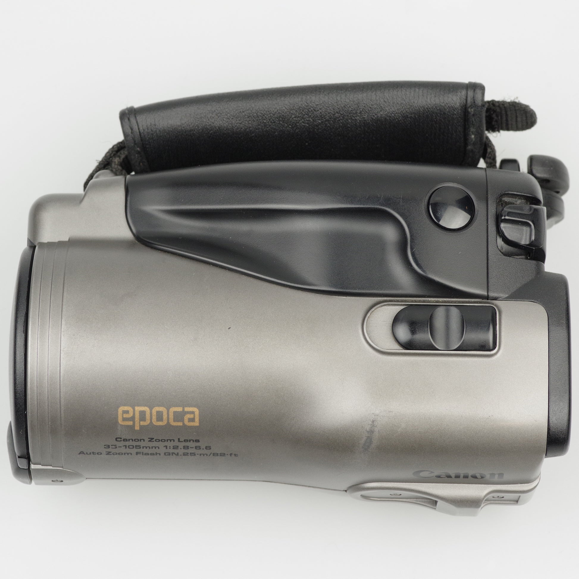 Canon Epoca is an analog bridge-style 35mm film camera, positioned between compact point-and-shoot models and SLR cameras. It combines a fixed zoom lens with autofocus and fully automatic exposure in a distinctive integrated body design.