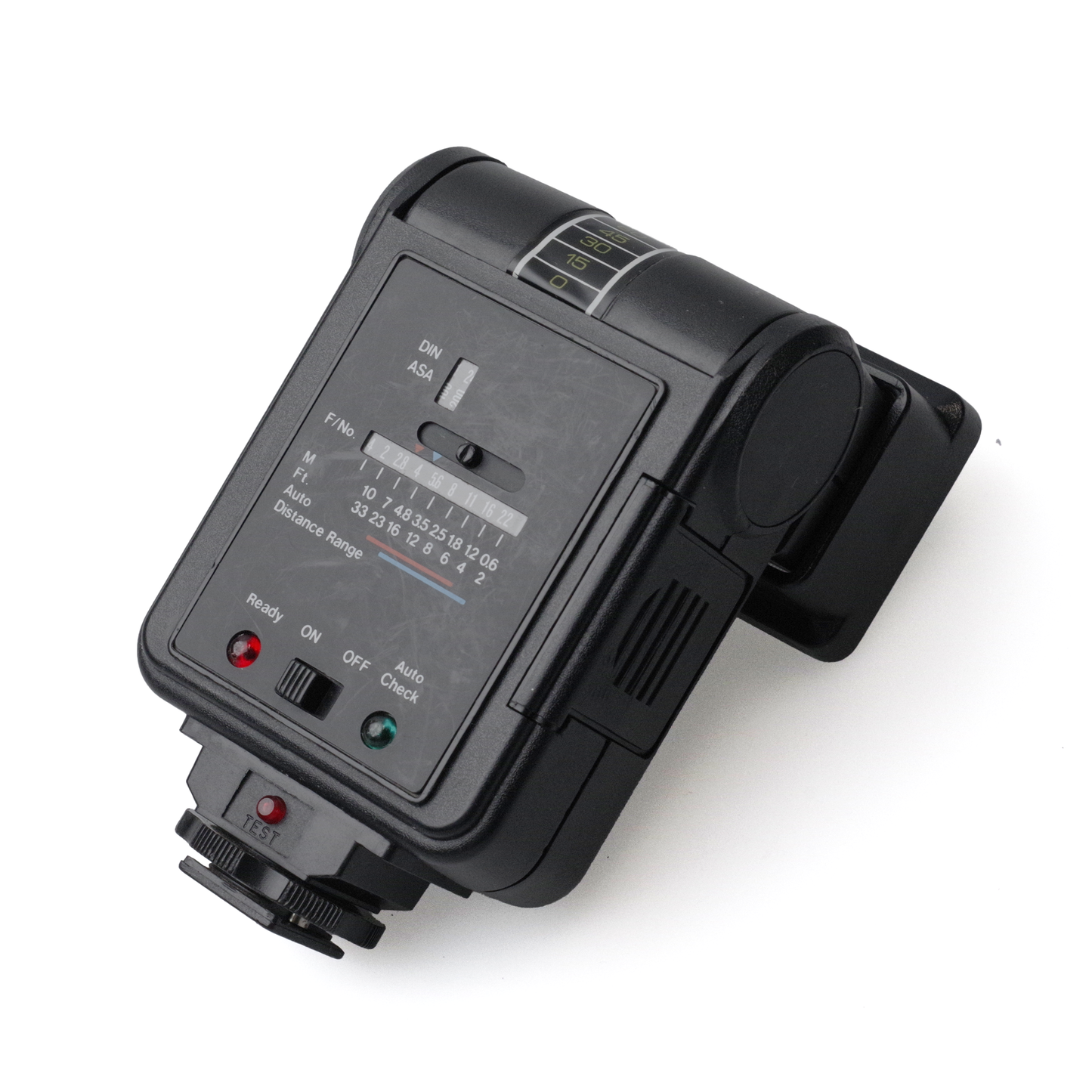 Second-hand Praktica flash compatible with any camera featuring a hot shoe. Tested, in working condition. Shows regular signs of use. It offers manual flash control via a single contact point, with three power settings and a flash head that tilts up to 90º. Powered by four AA batteries.